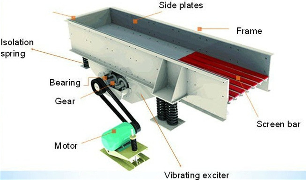 The vibrating feeder utilizes electromagnetic vibrating device to drive minerals to reciprocate in the direction of dip. When the vertical component of accelerated speed of feeder exceeds accelerated speed, minerals are tossed upward and leap forward in parabolic fashion. It takes 1/5 second to finish the rising and falling. The chute vibrates for one time and subsequently the minerals are tossed for one time. The chute vibrate at a frequency 3000/minute. Correspondingly, minerals are tossed upward and leap forward. So minerals can continuously and uniformly move forward and feeding is achieved.